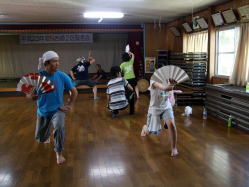 | 翌日8日は、岩崎鬼剣舞保存会の皆さんに、基本の舞「一番庭」を教えていただきました。見た目以上に複雑な手足の動きに、???。腰を低く下ろし、高く跳躍する動作、扇を操る動きに、見よう見まねで必死について行きます。1時間半ほどかけて、なんとか「一番庭」の最後まで辿りつきました。ひとつの芸能が伝え続けられることの重みを、理屈抜きに体感する時間となりました。 |